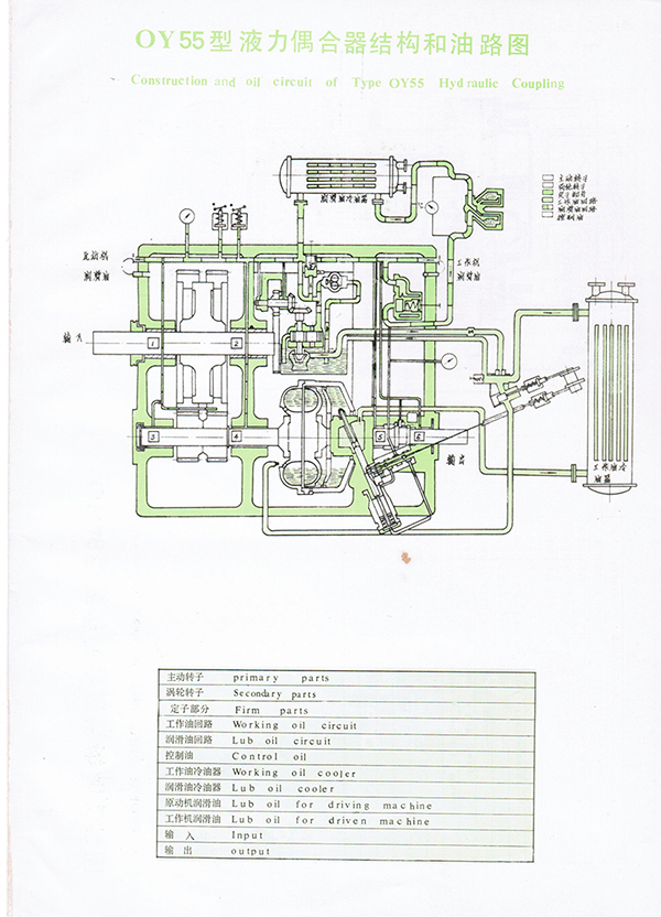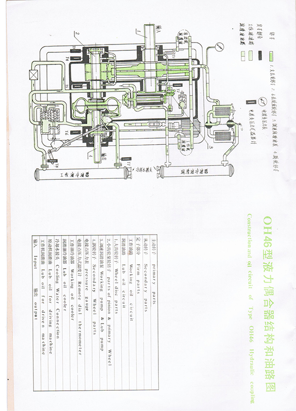 Type OH46 and OY55 hydraulic coupling combine a step-up gear and a hydraulic coupling in a closed housing.Main parts: housing, oil tank,wheel disc, pinion, primary wheel, secondary wheel, outer shell,scoop tube , control equipment, working oil pump, lubricating oil pump,etc.