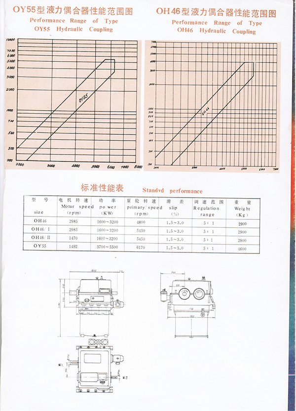 Type OH46 and OY55 hydraulic coupling combine a step-up gear and a hydraulic coupling in a closed housing.Main parts: housing, oil tank,wheel disc, pinion, primary wheel, secondary wheel, outer shell,scoop tube , control equipment, working oil pump, lubricating oil pump,etc.